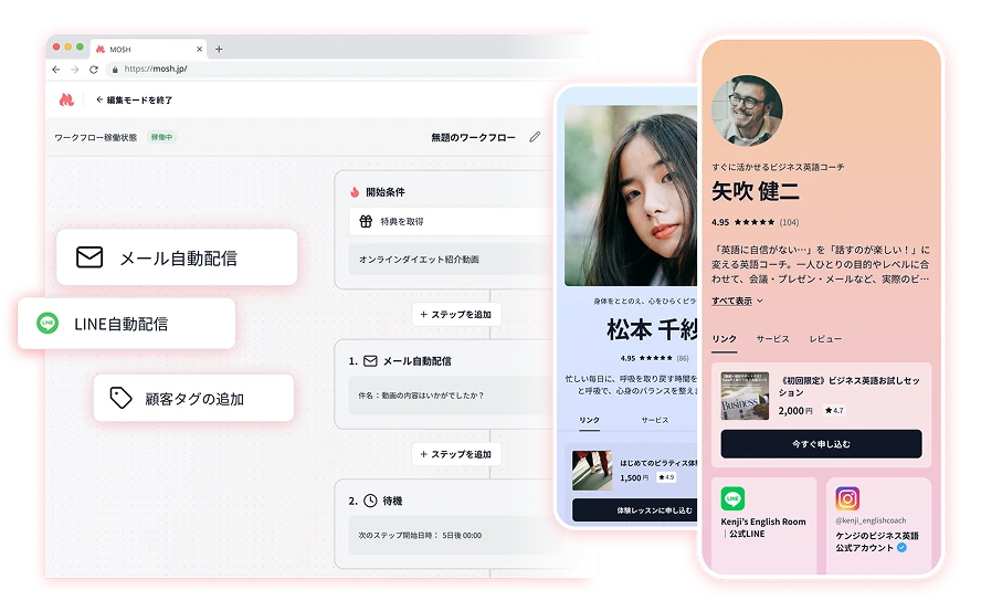 予約から決済、コンテンツ管理、メッセージ配信まで、サービス販売に必要なものをすべて一つに。 スムーズな顧客体験を支えます。